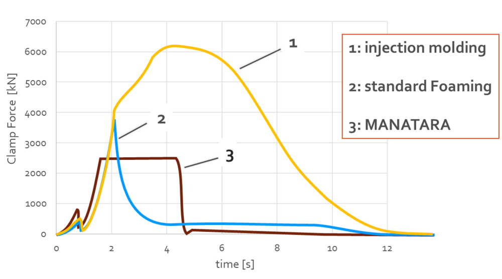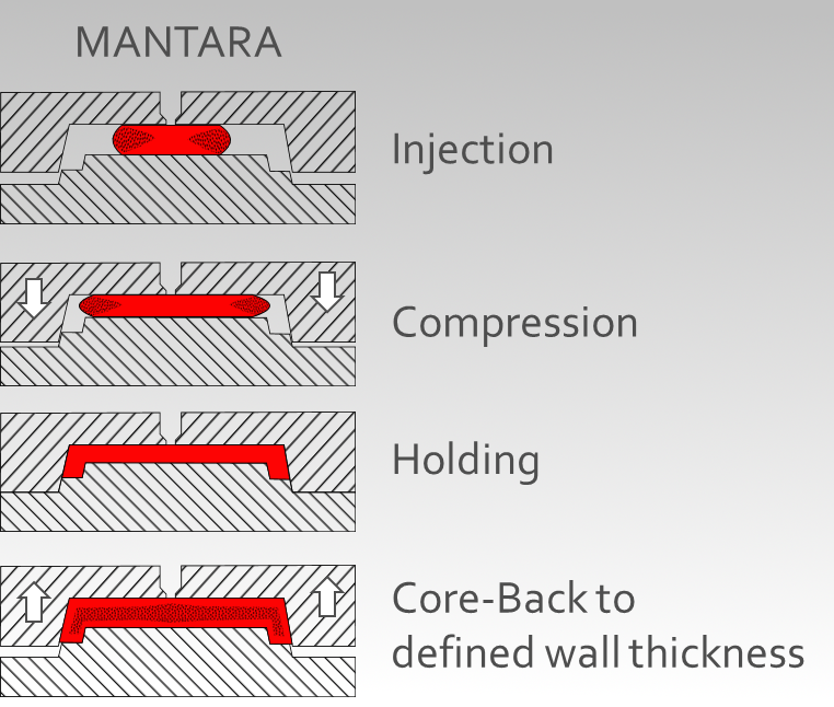 Die Gasbeladene Schmelze wird in das teilweise geöffnete Werkzeug eingespritzt. Anschließend findet der Prägeprozess statt der die Kavität anschließend vollständig füllt. Diese Prägekraft wird eine definierte Zeit gehalten und das Werkzeug öffnet um einen definierten Spalt. Durch den Druckabfall beim Öffnen startet die Blasenbildung im gesamten Kern. Daraus resultieren verschiedene Vorteile für Bauteil und Werkzeug.
